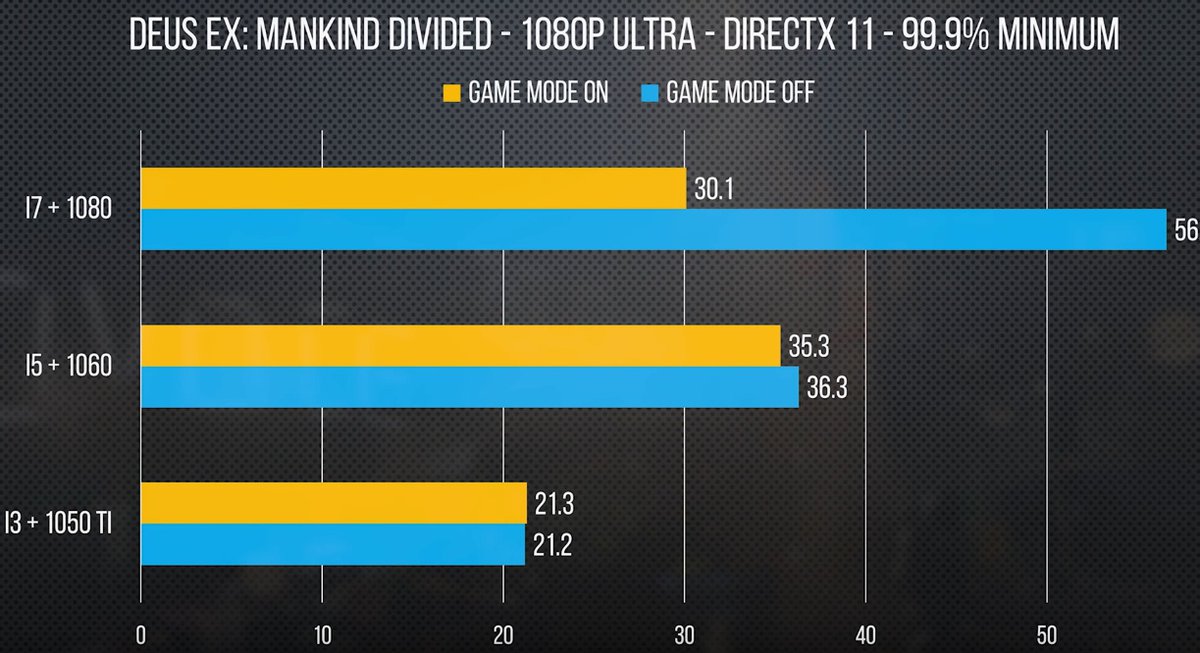 Linus Tech Tips собрали условный мощный (Intel Core i7-7700K и Nvidia GeForce GTX 1080), средний (Intel Core i5-7600K и Nvidia GeForce GTX 1060) и бюджетный (Intel Core i3-7350K и Nvidia GeForce GTX 1050 Ti) PC и протестировали работу Игрового режима в следующих играх: Deus Ex: Mankind Divided (DirectX 11, DirectX 12), Gears of War 4 (DirectX 12), Ashes of the Singularity (DirectX 11, DirectX 12).