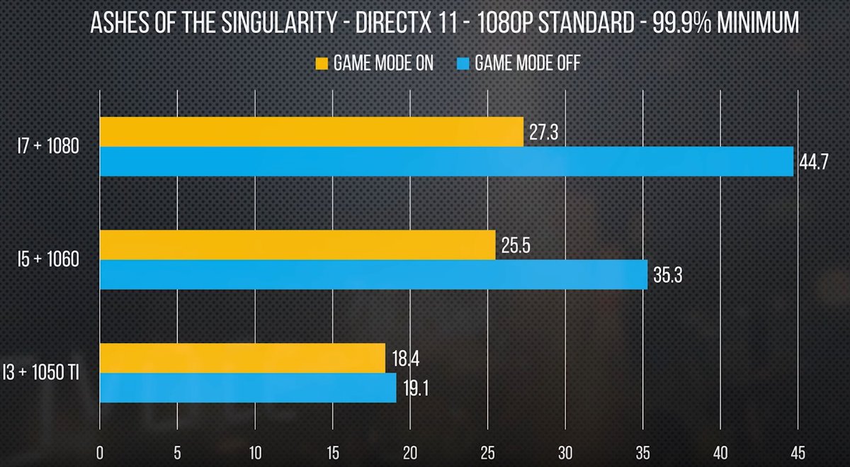 Включенный Игровой режим мог снижать ее чуть ли не вдвое. Например, на мощном PC в Ashes of the Singularity 99 перцентиль минимальной частоты кадров для выключенного режима составлял 44.7 fps, активация Игрового режима понижала минимальную частоту кадров до 27.3.