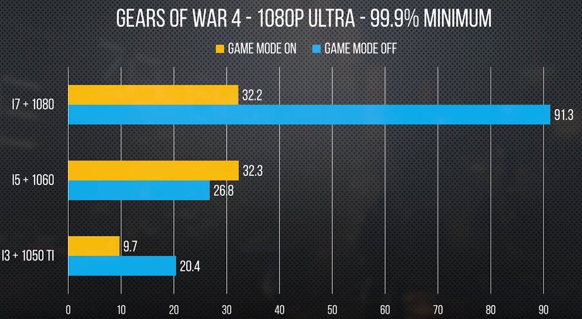 Самая значительная просадка была замечена в Gears of War 4. Здесь выключенный Игровой режим обеспечивал минимальную частоту кадров на уровне 91.3 fps, включение Игрового режима понизило минимальную частоту кадров до 32.2 fps.