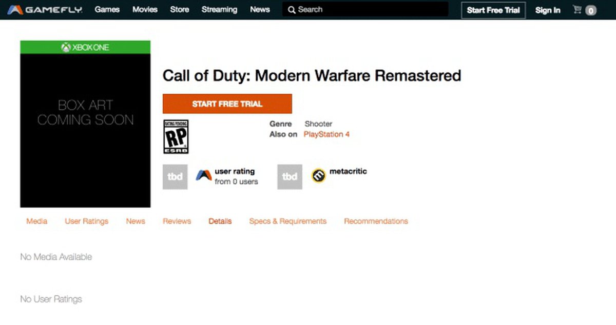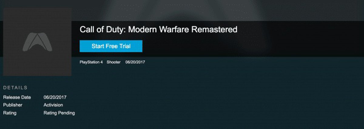На сайте американского сервиса GameFly, сдающего в аренду игры для консолей, на некоторое время появились отдельные страницы ремастера Call of Duty: Modern Warfare для PlayStation 4 и Xbox One. На PlayStation 4 ремастер должен был появится 20 июня, на Xbox One - 20 июля.