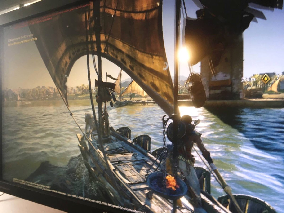 Утверждается, что на этой фотографии запечатлен тот самый Assassin’s Creed Origins, какие-либо источники изображения не приводятся. Что мы видим? Некий персонаж со щитом и луком управляет небольшим корабликом, скользящим по какой-то очень серьезной реке.