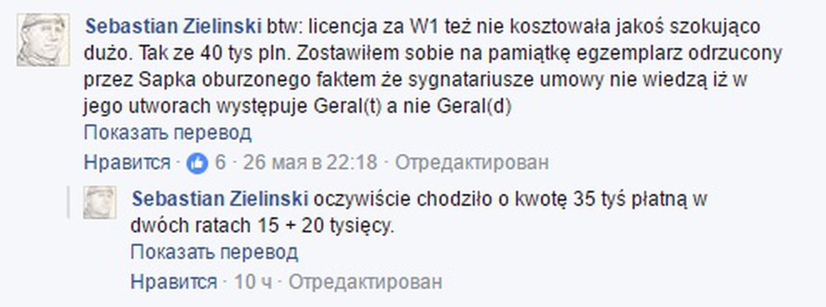 В комментариях к посту Адриана Хмеляжа (одного из основателей Metropolis Software) Себастьян пишет, что Анджей Сапковский получил от CD Projekt два перевода на сумму в 15 и 20 тысяч злотых - всего 35 тысяч злотых. Зелиньский утверждает, что сохранил в качестве сувенира копию одной из версий соглашения, так что он, видимо, знает о чем говорит.