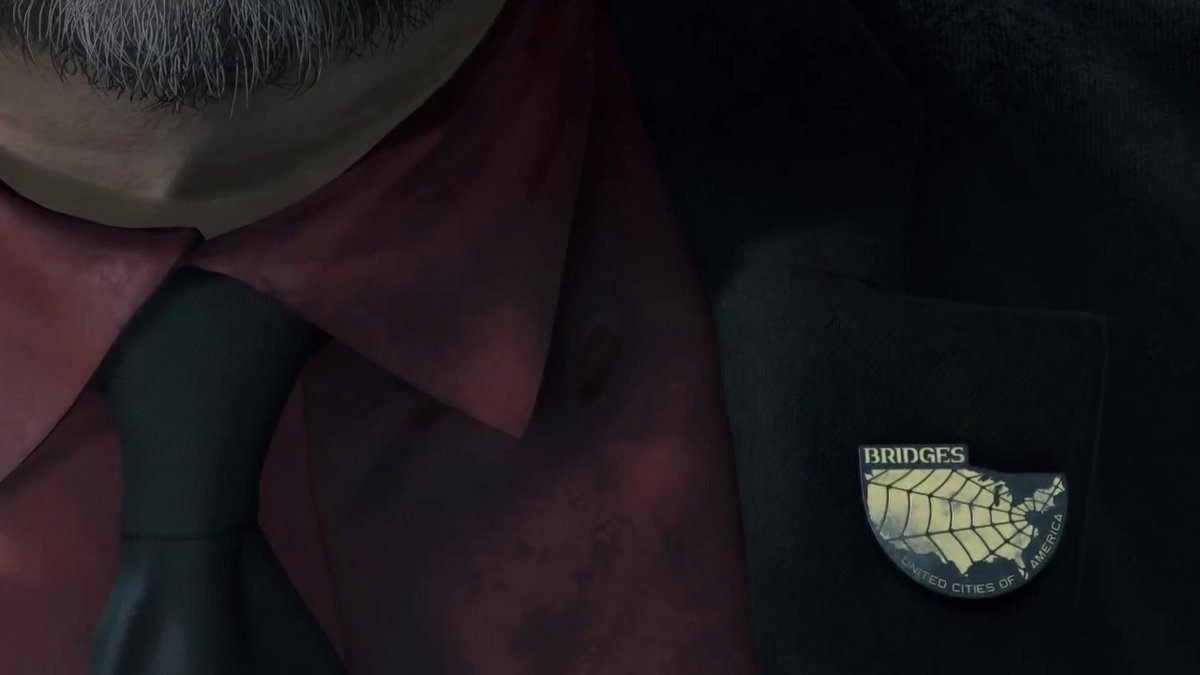 Помните персонажа Гильермо дель Торо, одного из главных героев трейлера Death Stranding, показанного на The Game Awards? На лацкане пиджака героя дель Торо был значок с надписью BRIDGES и паутиной, покрывающей карту США. Обратите внимание на подпись: "United Cities of America", "Соединенные города Америки".