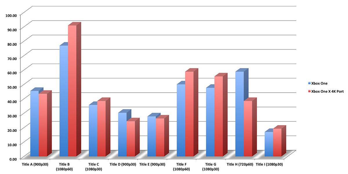 Как можно заметить, у 5 из 9 игр после переноса на Xbox One X и повышения разрешения до 4К частота кадров стала даже выше, чем в версии для обычного Xbox One. У остальных проектов, за исключением игры H (Battlefront?) зафиксировано небольшое уменьшение частоты кадров. Значительную просадку частоты кадров у игры H можно объяснить девятикратным ростом рабочего разрешения.