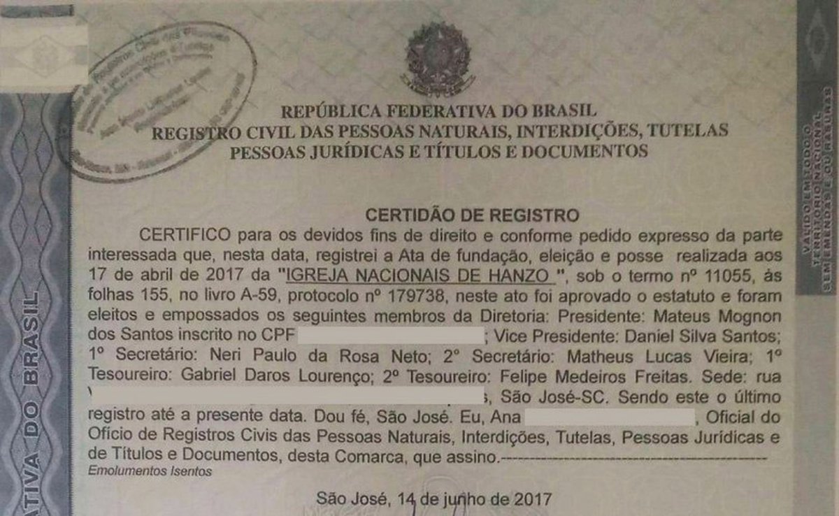 Как оказалось, в Бразилии процесс регистрации религиозной организации выглядит довольно просто. Итак, для регистрации Национальной Церкви Хандзо понадобилось пять соучредителей, юридический адрес, устав религиозной организации, заверенный нотариусом, и подпись адвоката. Матеуш пишет, что основать церковь даже легче, чем создать коммерческую компанию.