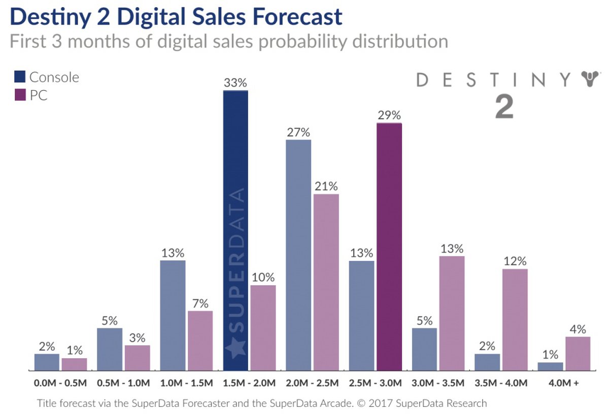 В SuperData считают, что общие продажи Destiny 2 в первые три месяца могут достичь отметки в 4 или 5 миллионов копий. К этой цифре в компании пришли, проанализировав динамику продаж первой части Destiny и сравнив ее с результатами других AAA-проектов. Прогноз также учитывает релизное окно Destiny 2 и влияние Battle.net на продажи PC-версий игры.