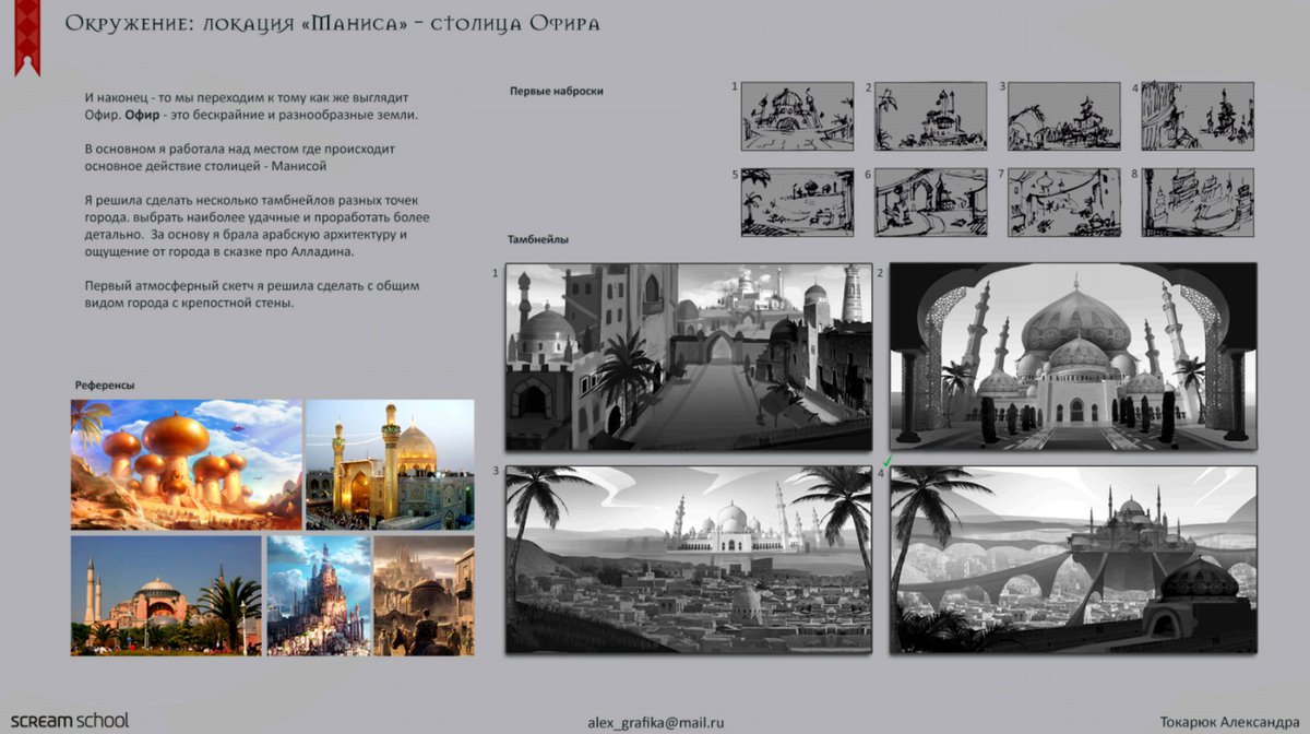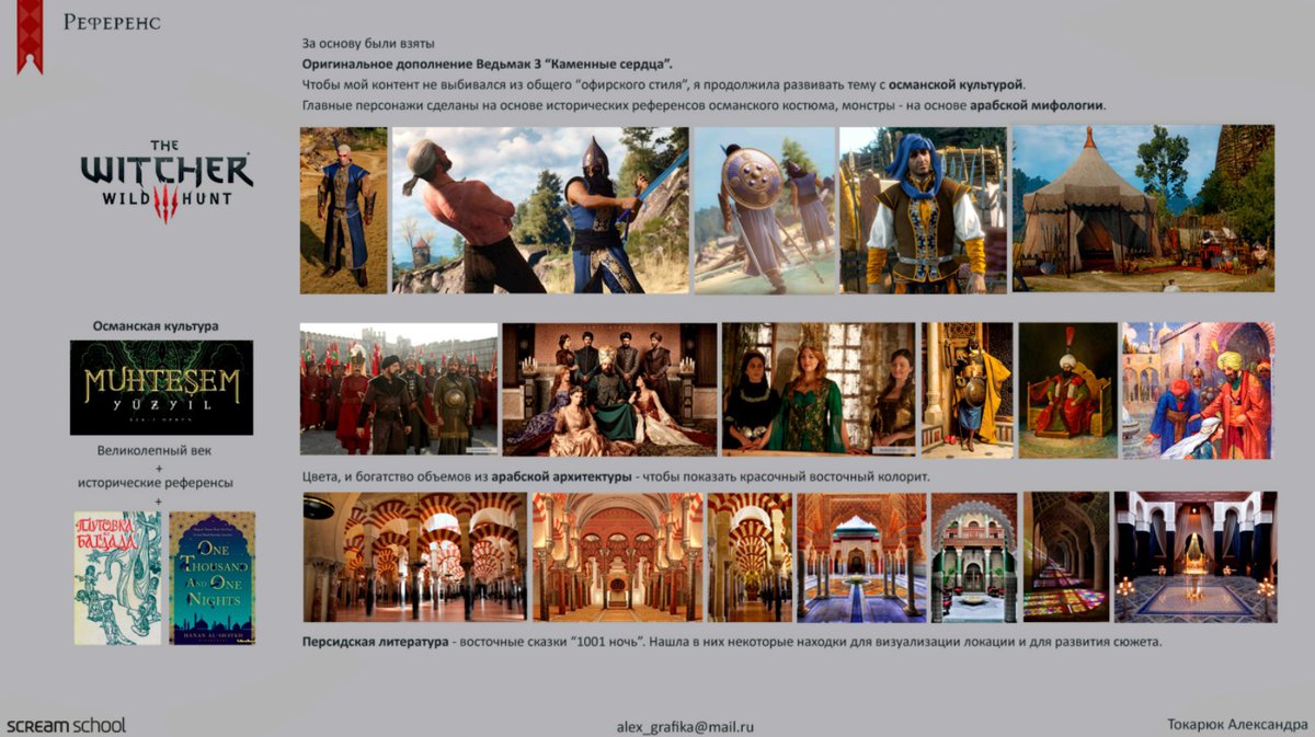 Художник и дизайнер Александра Токарюк опубликовала у себя на Facebook дипломную работу, сделанную по итогам учебы в школе компьютерной графики Scream School. Для своего диплома Александра выбрала очень любопытную тему: она попыталась представить, как могло бы выглядеть третье дополнение для The Witcher 3, отправляющее Геральта в Офир.