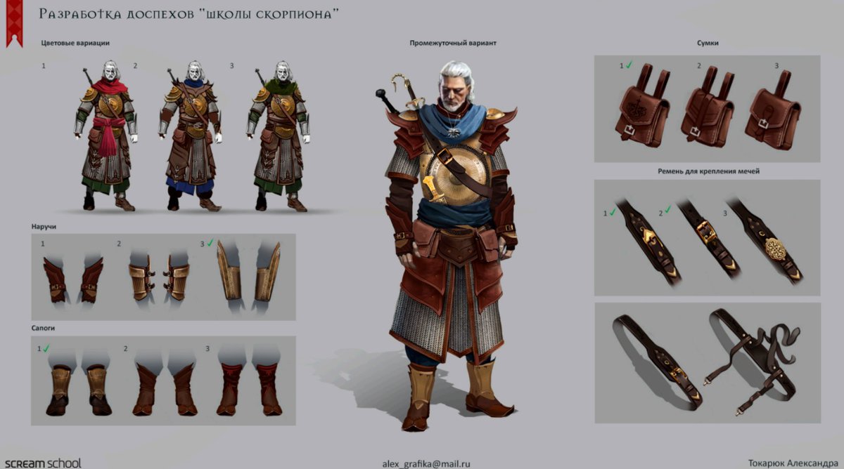 В частности, во время работы над доспехами "Школы Скорпиона" Токарюк опиралась на настоящие османские доспехи XV - XVI веков. Оружие этой школы напоминает одновременно саблю и ятаган.