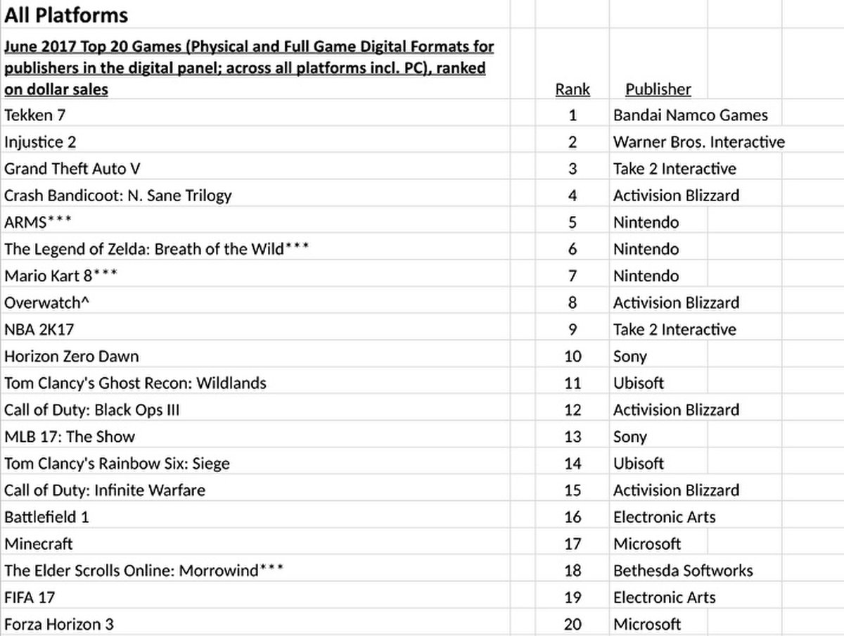 Самой продаваемой игрой июня на американском рынке стал файтинг Tekken 7, второе место занимает еще один новый файтинг, Injustice 2. Третье место досталось ветерану Grand Theft Auto 5, на четвертом - сборник Crash Bandicoot N. Sane Trilogy. В Activision утверждают, что всего за два дня продаж N. Sane Trilogy стал самым крупным релизом июня на физических носителях.