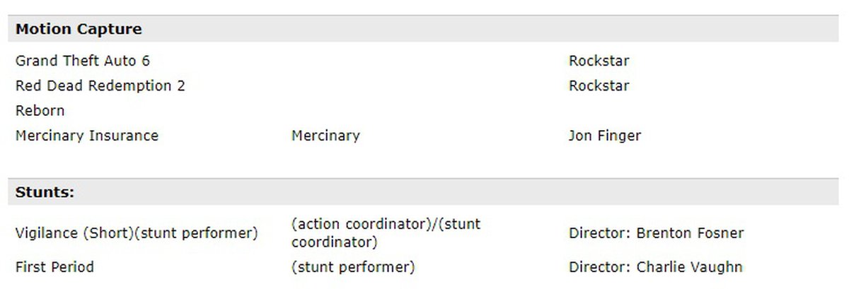 На странице Тима упоминается участие в записи анимаций сразу для двух еще не вышедших игр Rockstar Games: Red Dead Redemption 2 и Grand Theft Auto 6. Разумеется, полностью доверять этой информации нельзя.