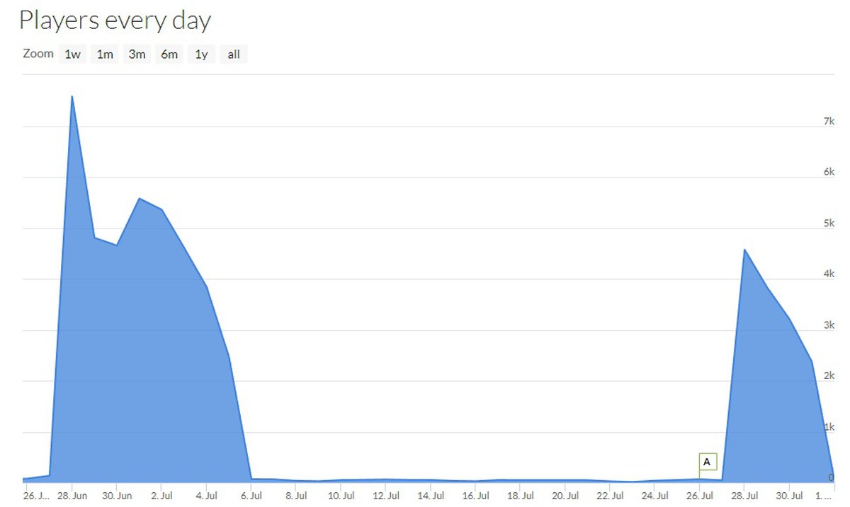 Действительно, согласно данным SteamDB пиковый онлайн бета-версии LawBreakers во время первого открытого теста достигал 7.5 тысяч человек и большую часть теста оставался на достаточно высоком уровне. Спустя месяц ситуация изменилась.