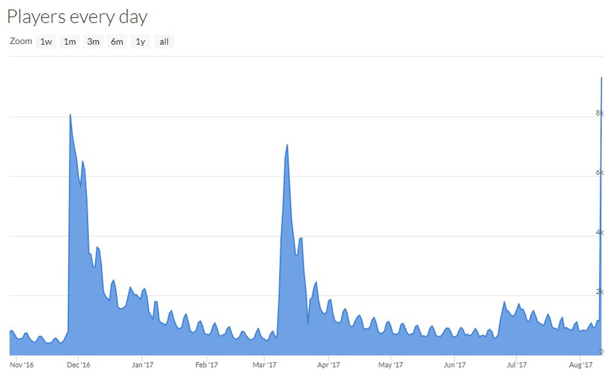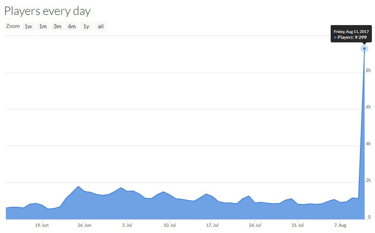 Так много людей играли в No Man's Sky только в первые недели после релиза. Уже в начале сентября прошлого года, через три недели после выхода, максимальный онлайн Steam-версии игры едва достигал 9 тысяч игроков. Теперь No Man's Sky, пусть и на какое-то время, смог вернуться к этому показателю.