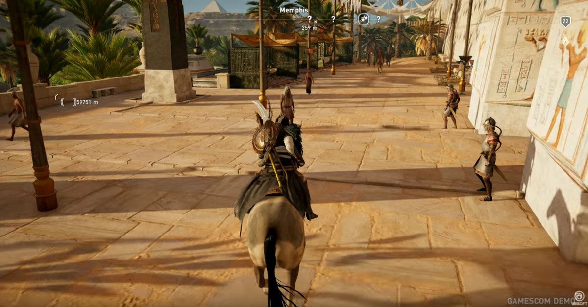 И здесь начинается самое интересное. На пятидесятой секунде видео мелькает кадр с Байеком, скачущим по Мемфику. Во-первых, Байек одет не в свой привычный белый наряд - об этом мы еще поговорим. Во-вторых, на экране видна маршрутная точка, отстоящая от героя почти на 60 километров.