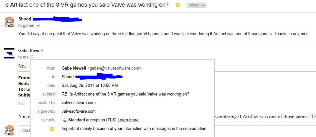 Пользователь Reddit Metalhand1000 решил выяснить, не входит ли Artifact в тройку VR-игр Valve. Metalhand1000 написал самому Гейбу Ньюэллу и вскоре получил короткий ответ. Оказалось - нет, Artifact это четвертая игра Valve, а не один из VR-проектов компании.