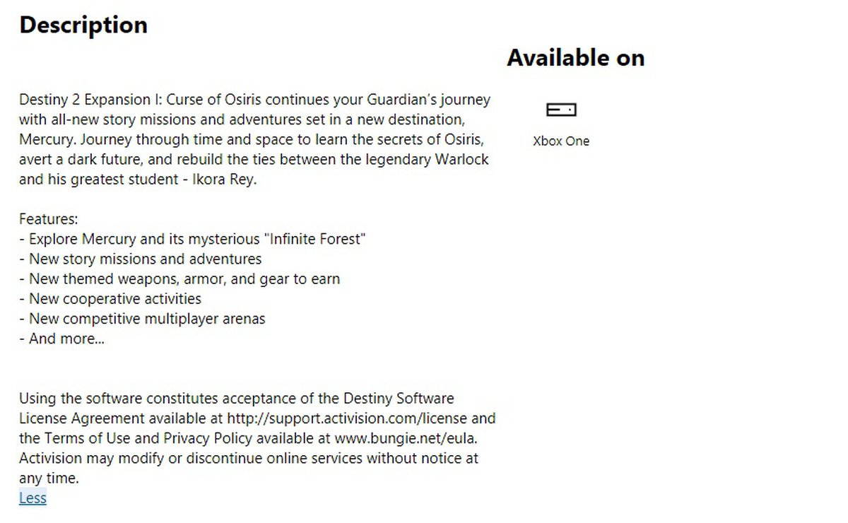 Источники Kotaku были правы. Первое дополнение для Destiny 2 действительно называется The Curse of Osiris - страница дополнения сегодня появилась в магазине Microsoft Store.