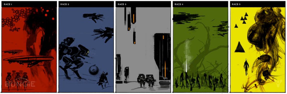 В первых четырех расах узнаются Улей, Вексы, Кабал и Падшие. Пятая раса в Destiny так и не появилась - а между тем, именно на арте этой расы появляются пирамиды и всплески тьмы. Журналисты считают, что пятая раса может быть именно Тьмой.