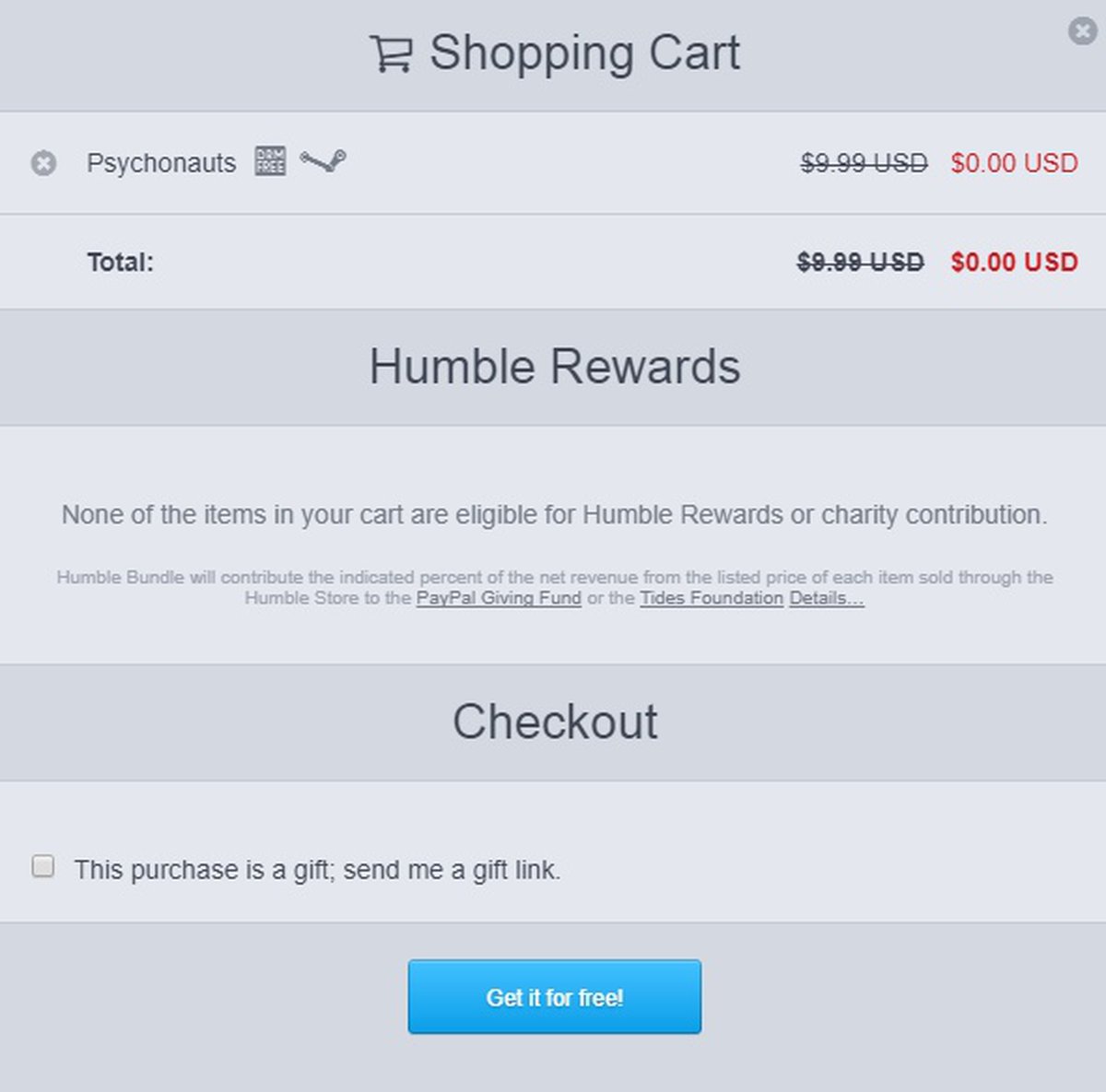 Уже есть учетка? Отлично. Заходите на страницу Psychonauts, жмите кнопку "Add to Cart" и переходите в корзину - ваше окошко должно выглядеть примерно так. Не заполняйте никакие дополнительные поля и не ставьте галочки, гифты вам не нужны.