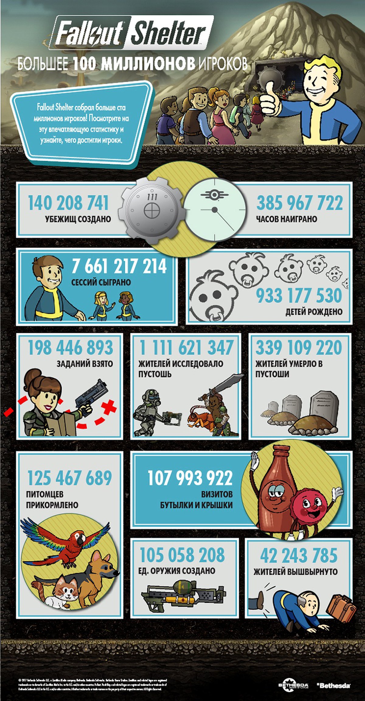 По прежнему играете в Fallout Shelter? Вы не одиноки. Bethesda Softworks опубликовала инфорграфику, согласно которой в Fallout Shelter на всех платформах сыграли больше 100 миллионов игроков.