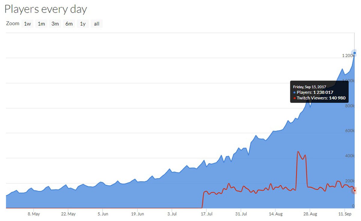 У Playerunknowns Battlegrounds, напротив, количество активных игроков растет взрывными темпами. Полгода назад о игре еще никто не слышал, три месяца назад в PUBG играли 220 тысяч человек одновременно, вчера игра пробила отметку в 1 миллион 200 тысяч игроков онлайн.