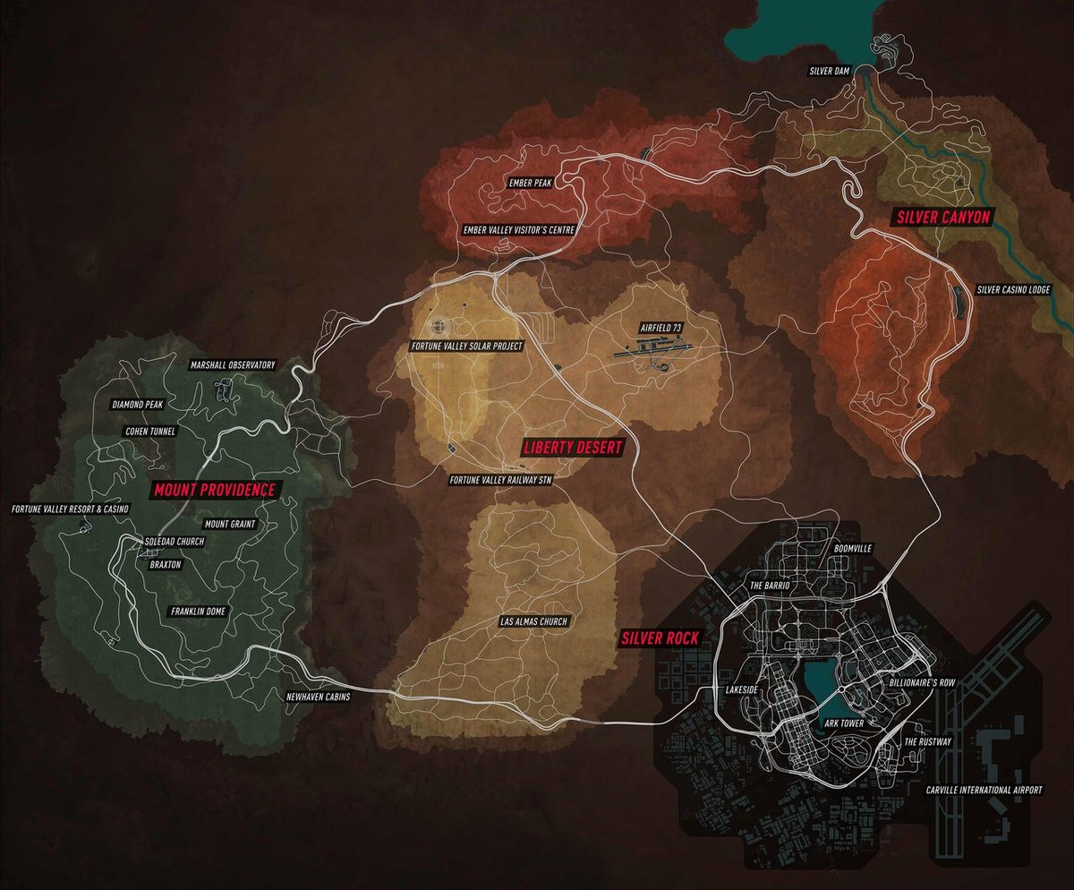 Либерти-Дезерт это то самое место, где можно зажечь на внедорожнике, проехав по старой ВПП; горные трассы Маунт-Провиденс радуют глаз своей красотой и потрясающим видом с вершины горы, а в Сильвер-Каньоне на севере Фортуна-Вэлли возвышается гигантская плотина, по которой можно промчаться не снижая скорости.