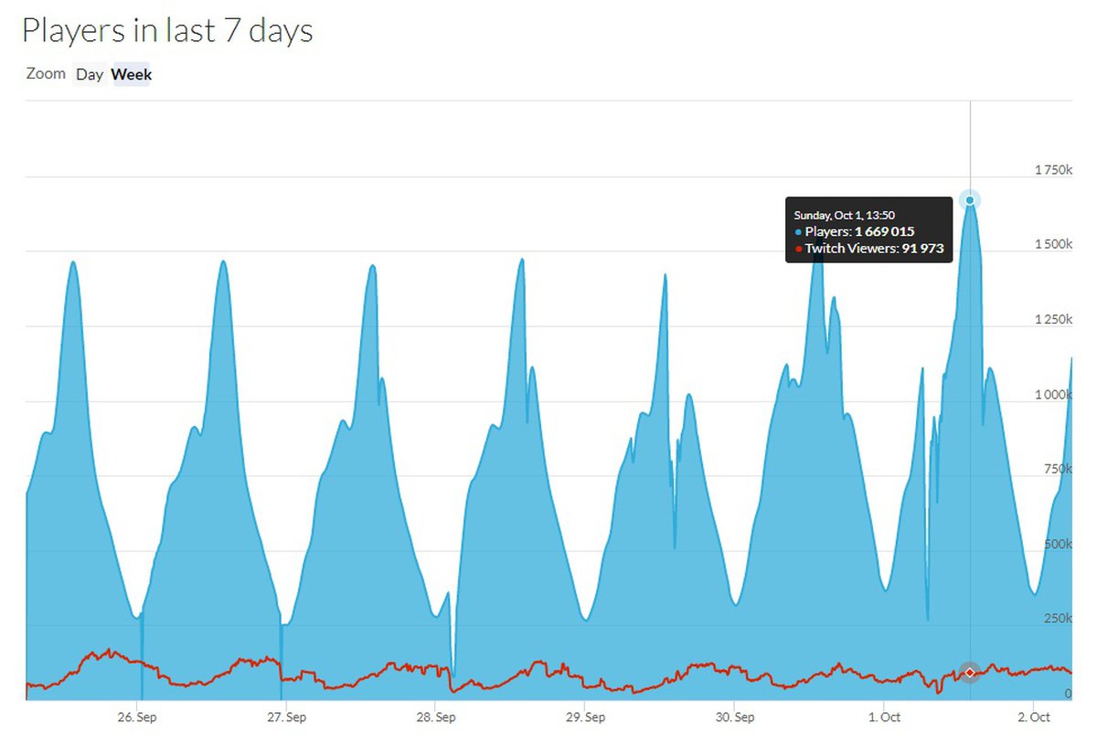 Воскресным вечером в Playerunknowns Battlegrounds одновременно находились 1669015 игроков - это почти на 140 тысяч больше, чем в прошлое воскресенье. Двухнедельная аудитория игры за это время выросла на 600 тысяч, до 9768582 человек.