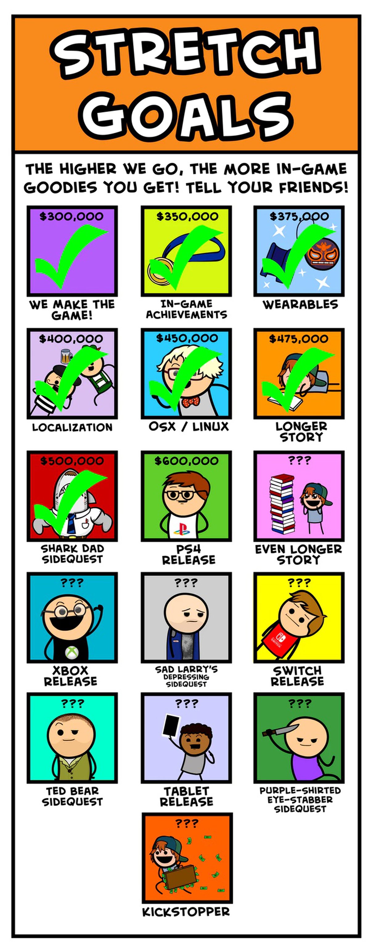 Первоначально команда планировала собрать всего $300000, за счет сбора дополнительных $275377 будут реализованы некоторые бонусные цели кампании. Благодаря активности фанатов в The Cyanide & Happiness Adventure появятся вот эти вещи: