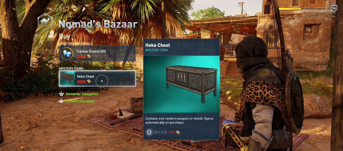 В одном из последних геймплейных роликов Assassin’s Creed: Origins ютубер Centerstrain01 заходит на базар кочевников. У одного из торговцев можно приобрести два предмета: некие "кристаллы углерода" (это материал для крафта) и ящик Heka Chest.