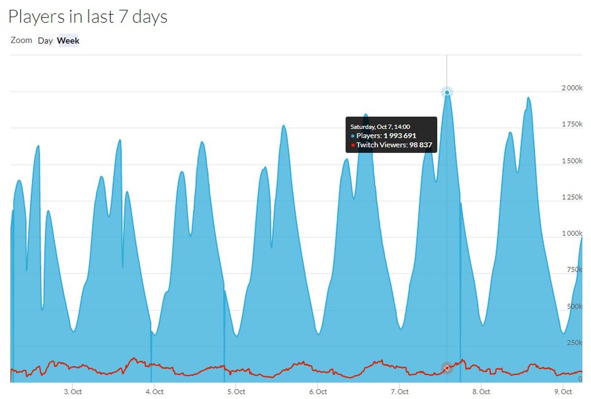 Самим сервисом Steam в субботу пользовались чуть больше 16 миллионов человек одновременно. Если пики Steam и PUBG совпадают, то в игре Bluehole Inc. находилось чуть больше 12% пользователей сервиса, активных в тот момент.