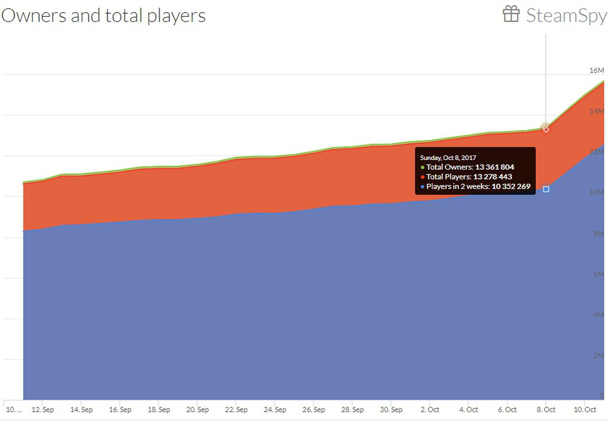 За последнюю неделю PUBG сильно прибавил в популярности: 4 октября в игре находились не больше 1655027 человек одновременно. Судя по приблизительным данным SteamSpy, количество активных игроков начало быстро расти с 8 октября.