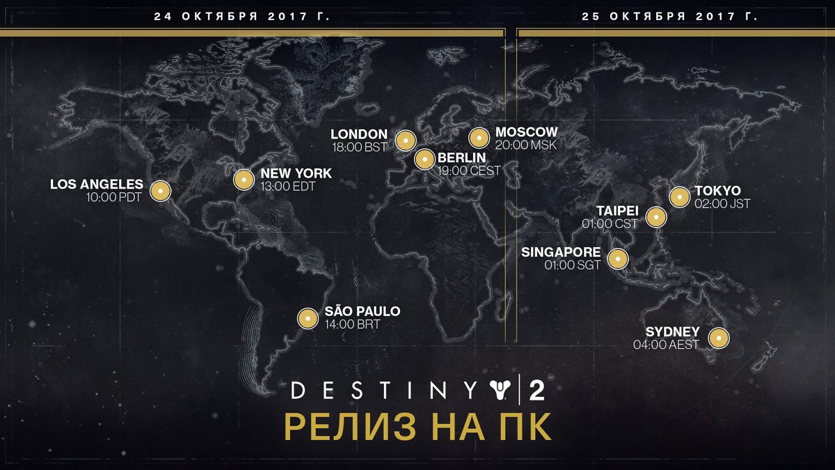 Destiny 2 выйдет на PC одновременно во всем мире. Запуск игры состоится 24 октября в 20:00 по московскому времени, клиент PC-версии игры по-прежнему распространяется только через приложение Blizzard Battle.net.