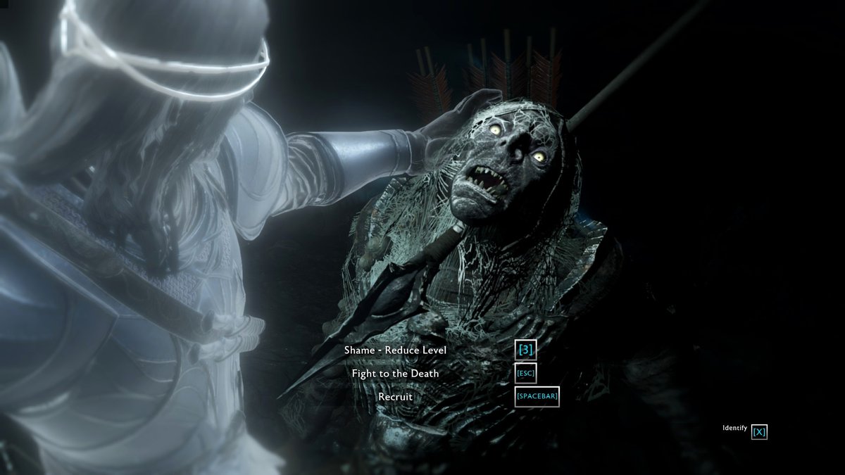 Просто удачный кадр, сделанный во время подчинения сломленного орка. Копье принадлежит другому капитану.