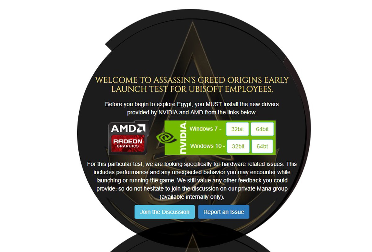 До выхода Assassin’s Creed: Origins остается чуть больше недели и Ubisoft, похоже, вовсю готовится к выпуску игры на PC. Судя по служебной странице, обнаруженной участниками сабреддита Assassin’s Creed, сотрудники компании проверяют работу игры с новыми драйверами AMD и Nvidia.