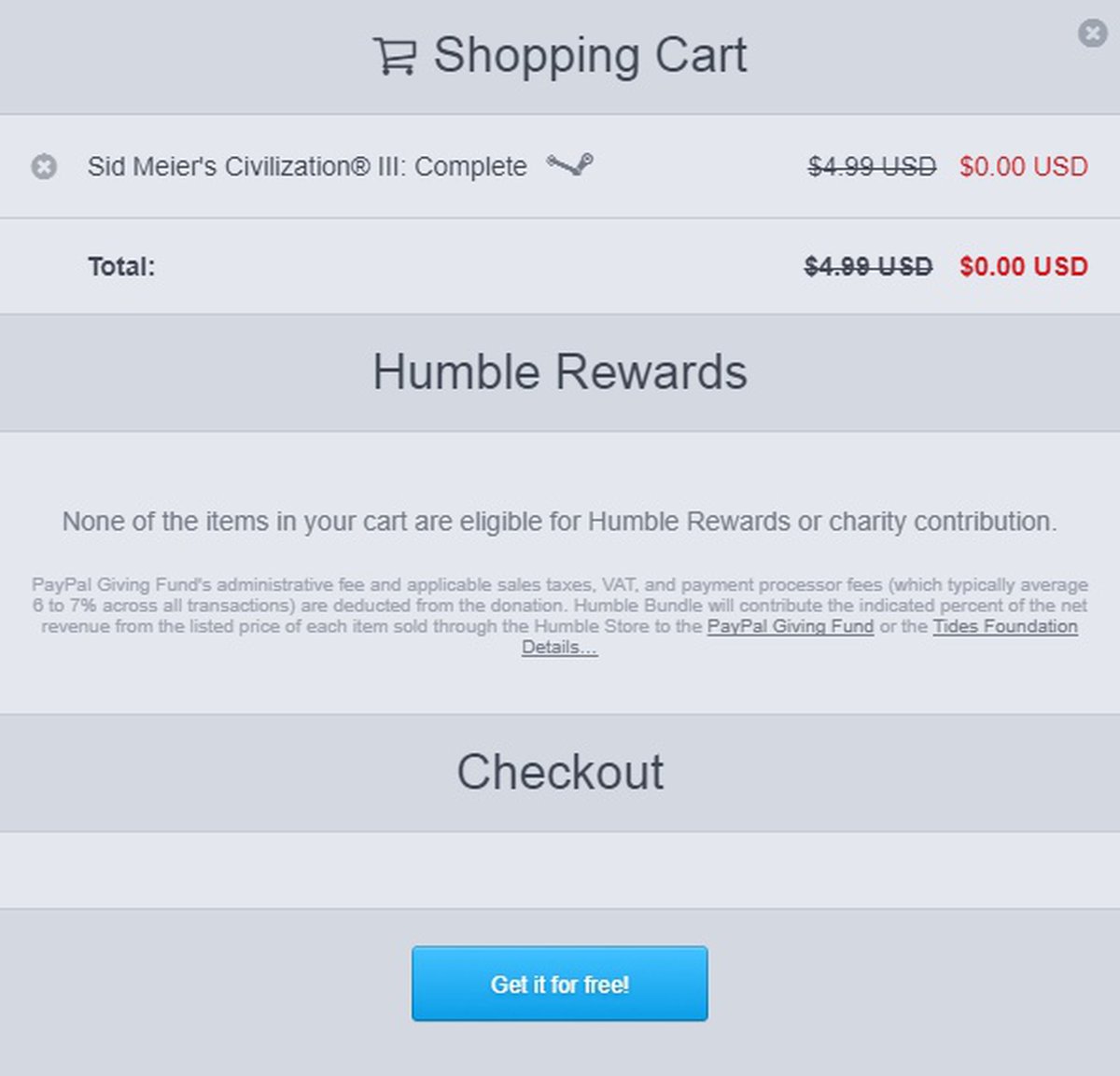Чтобы вернуть себе свой 2001-й год нужно для начала зайти на страницу Sid Meier’s Civilization 3 Complete в Humble Bundle, добавить игру в корзину и открыть ее. Вы увидите примерно такое окно: