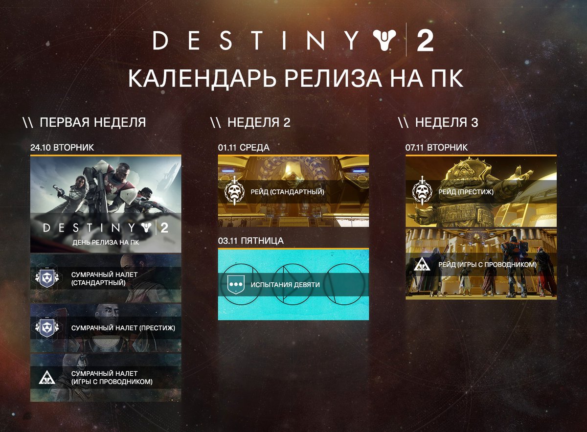 В день выхода на PC Стражи смогут пройти сумрачный налет на обычной уровне сложности и уровне "Престиж", а также побывать в налете в "Игре с проводником". Через неделю, 1 ноября, заработает рейд "Левиафан" на обычном уровне сложности.