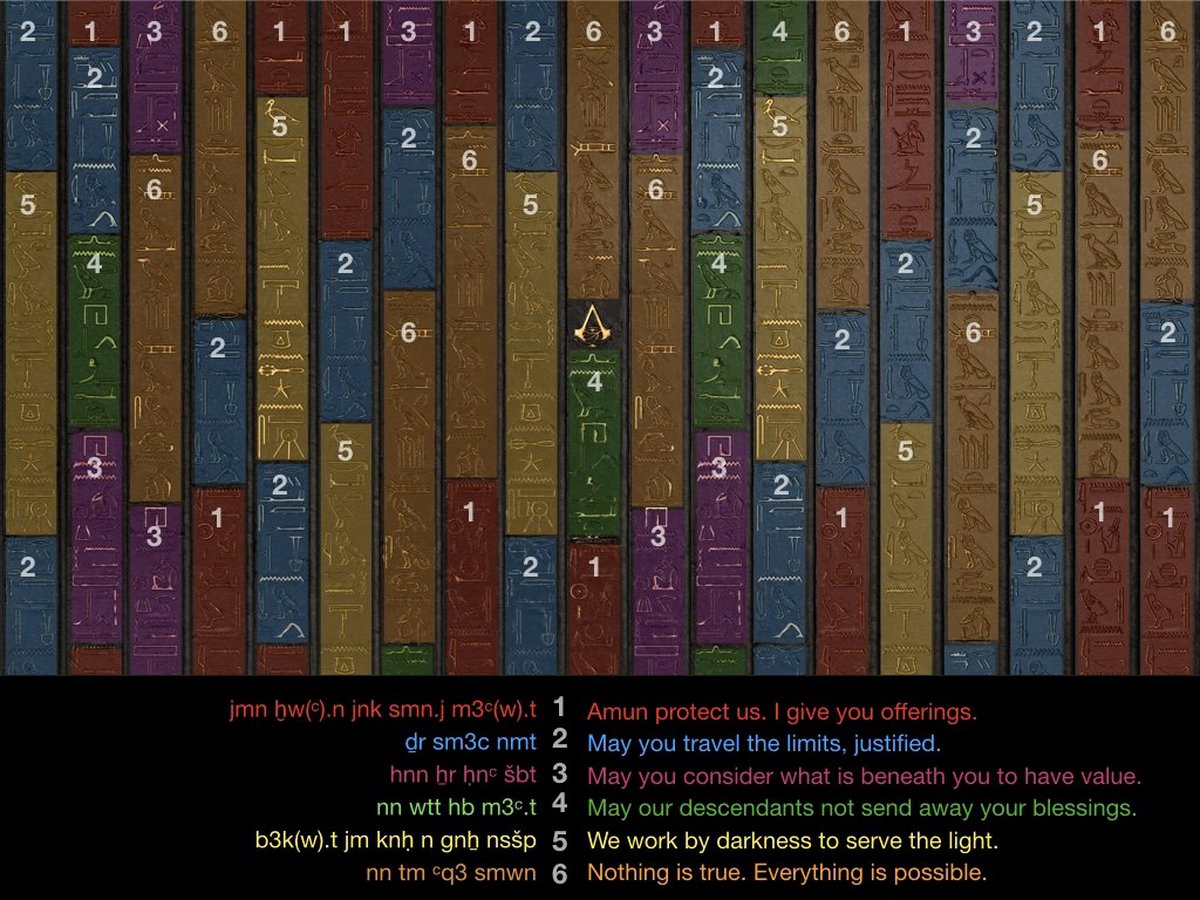 В результате Мэннинг обнаружила на постере Assassin’s Creed Origins всего шесть повторяющихся фраз. Особенный интерес вызывают два последних предложения: "Мы действуем во тьме, чтобы служить свету" и "Ничто не истинно. Все возможно". Очень похоже на Кредо братства Ассасинов.
