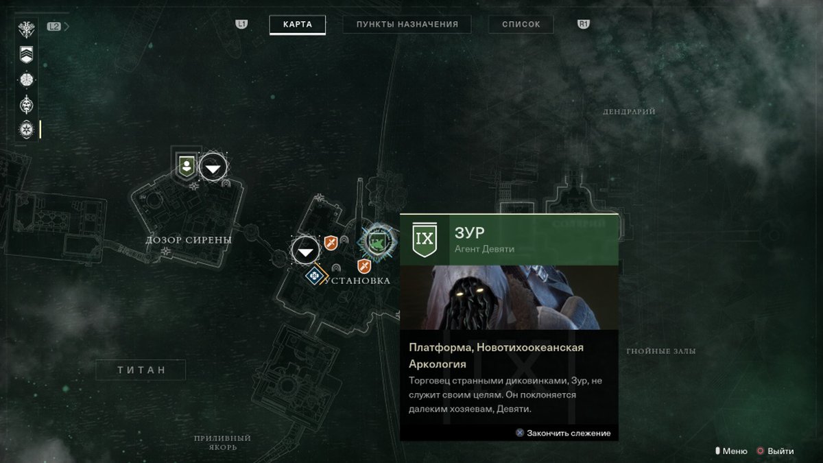 Загадочный адепт Девяти вновь предлагает Стражам потратить немного легендарных осколков на экзотическое снаряжение и оружие. В этот раз Зур приземлился на одной из платформ Титана.