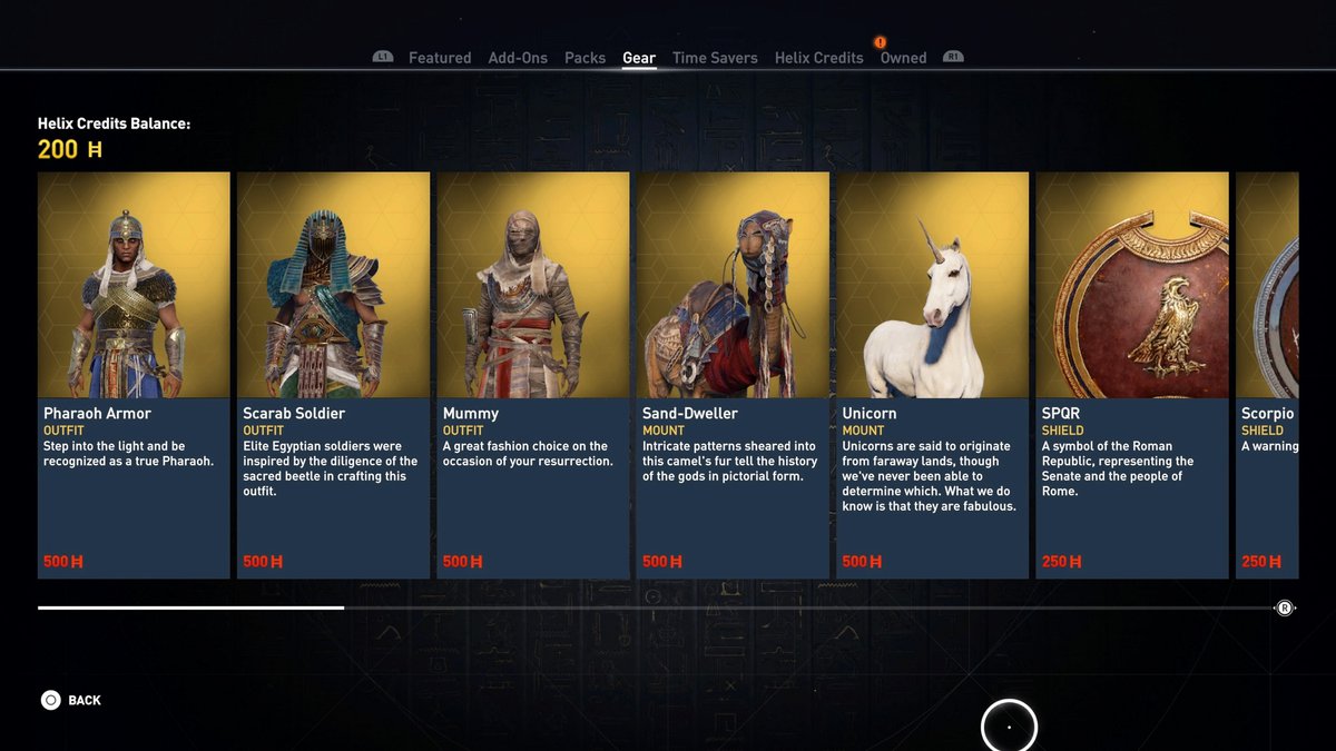 Сейчас за кредиты Helix можно купить несколько типов предметов. Во-первых, это уникальные наряды, меняющие внешний вид Байека: доспех фараона, доспех элитного бойца Скараба и наряд Мумии. Во-вторых, в магазине есть два верховых животных: верблюд и настоящий белоснежный единорог. Характеристик маунтов у нас нет.