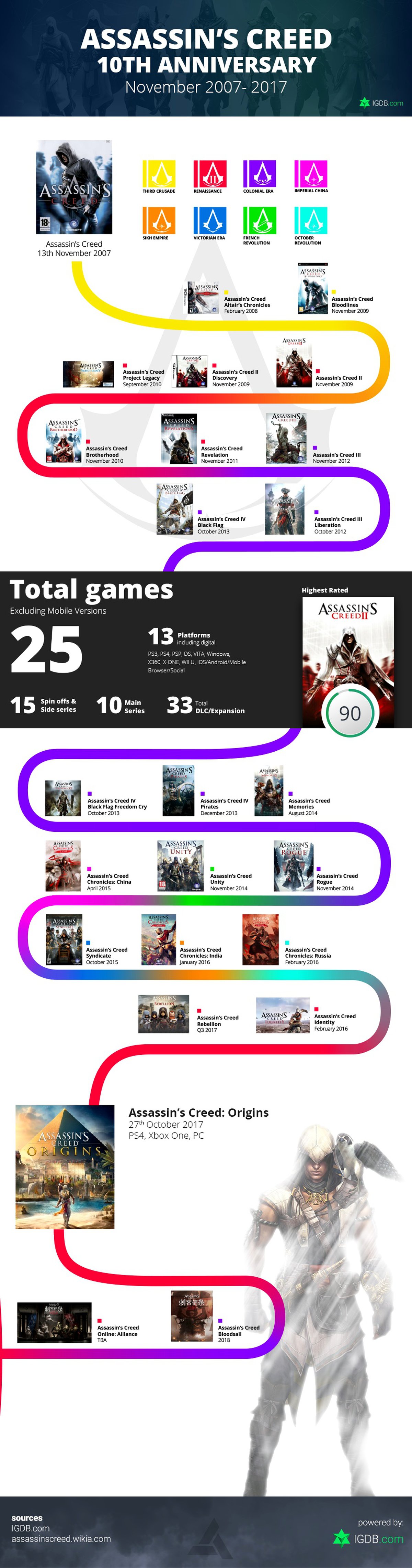 Специально к премьере Assassin’s Creed: Origins и юбилею всей серии команда IGDB подготовила инфографику, описывающую десятилетнюю историю Assassin’s Creed. За эти годы Ubisoft вместе с партнерами успели разработать 10 основных игр и 15 спин-оффов, выпустить 33 дополнения и расширения - все это на 13 платформах, включая мобильные устройства.