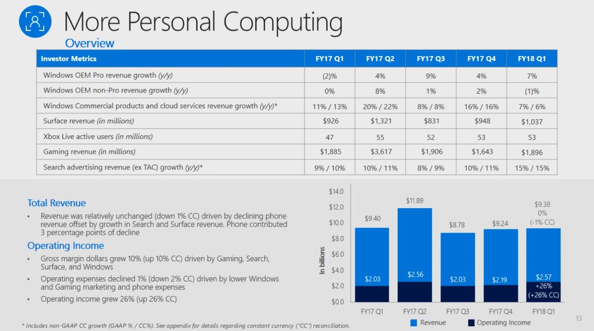 Корпорация Microsoft первой из крупных околоигровых компаний представила отчет за первый квартал 2018 финансового года - у Microsoft он закончился 30 сентября 2017 года. За квартал корпорация получила выручку в размере $24.5 миллиардов, на 12% больше, чем в том же квартале годом ранее.