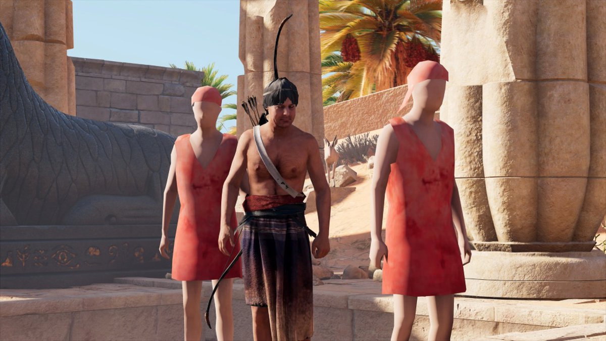 Скриншот еще одного глитча выложил в сабреддите Assassin's Creed игрок под ником squaredspekz. Здесь лучника сопровождают низкополигональные персонажи в красных косынках и туниках - похоже, вместо полноценных моделей загрузились шаблоны.