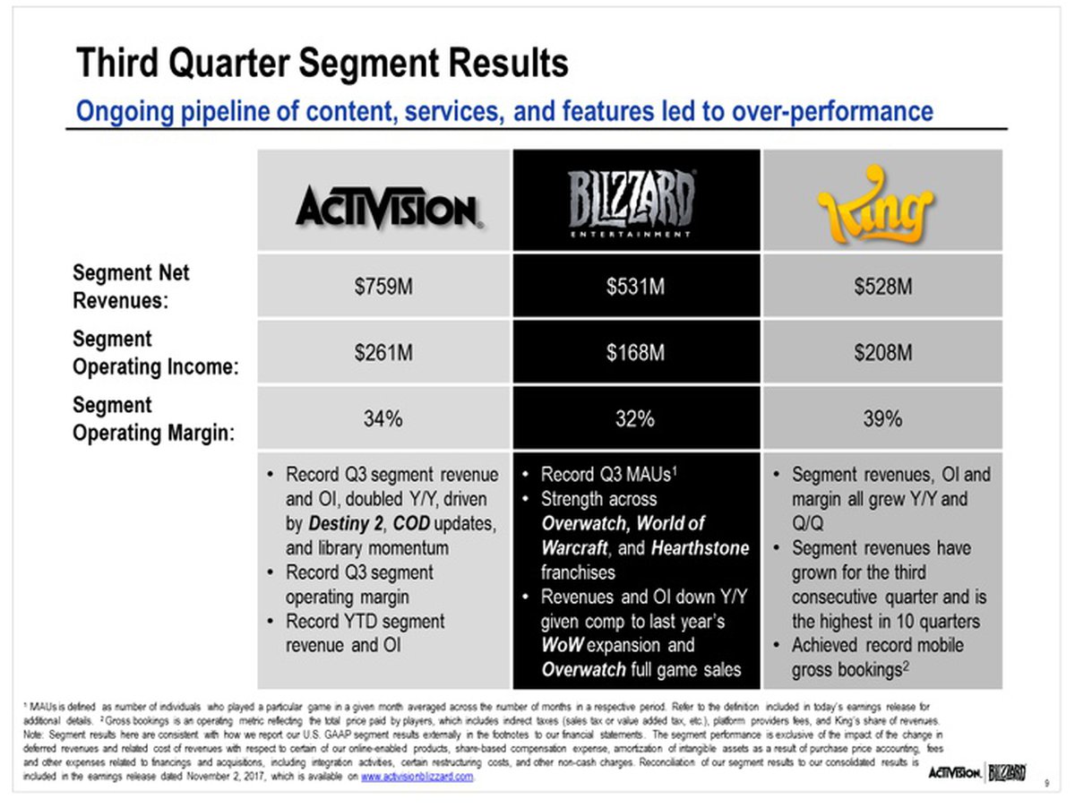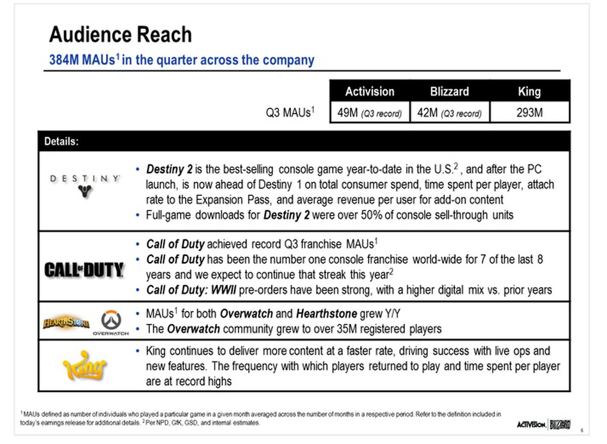 За минувший квартал Activision удалось заработать $759 миллионов, на долю Blizzard и King пришлось $531 миллион и $528 миллионов соответственно. Ростом доходов Activision обязана выходу Destiny 2: игра стала самым быстропродаваемым консольным проектом 2017 года, по сравнению с первой частью игроки проводят в Destiny 2 намного больше времени.