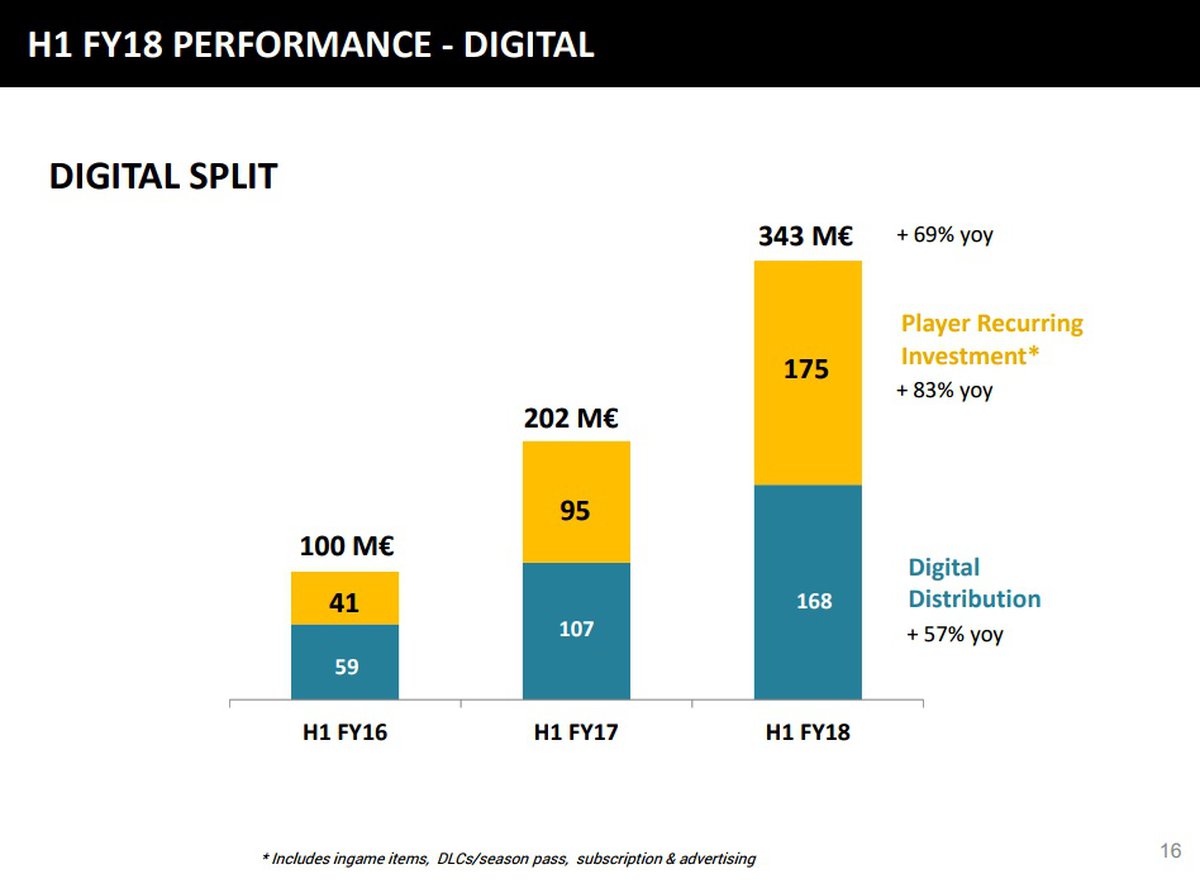 В минувшем квартале продажи компании заметно превысили прогноз: они зафиксированы на уровне €264 миллионов при ожидании в €190 миллионов. Большую часть доходов Ubisoft приносят цифровые продажи: в первом полугодии 2018 финансового года на них пришлось €343 миллиона. Из этой суммы €175 миллионов приходятся на внутриигровые покупки.