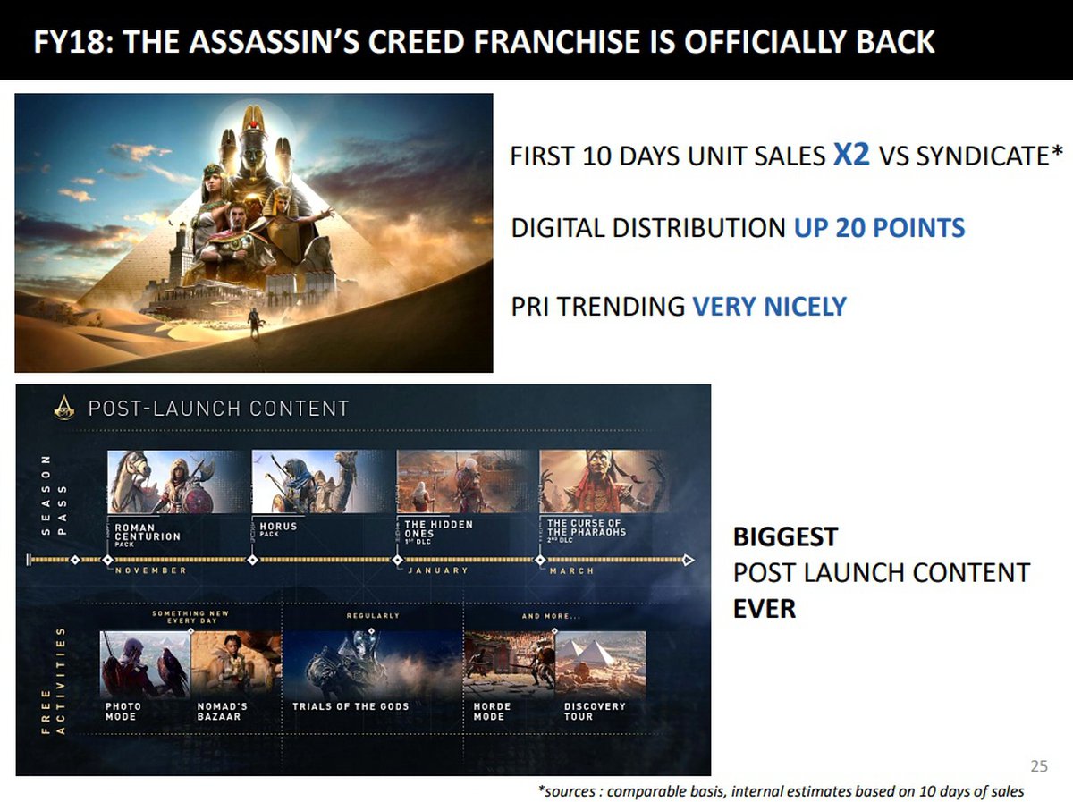 Отдельного упоминания в отчете Ubisoft удостоился Assassin’s Creed Origins. Последняя на данный момент часть серии продается очень хорошо: за первые 10 дней после релиза было продажи Origins вдвое превысили результат предыдущей игры, Assassin's Creed Syndicate, достигнутый за тот же срок.