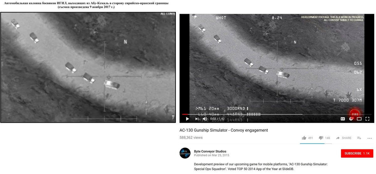 На подписи к спорной фотографии утверждается, что она сделана 9 ноября 2017 года. Команда Conflict Intelligence Team обнаружила, что на самом деле это изображение - фрагмент геймплейного ролика игры AC-130 Gunship Simulator: Special Ops Squadron.