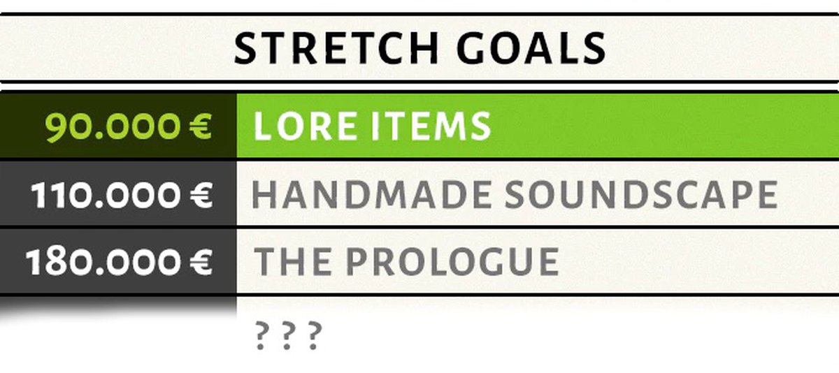 В данный момент на Truberbrook собрано €106224, разработчики надеялись привлечь как минимум €80000. Пока студия назвала три дополнительных цели кампании: введение в игру множества небольших предметов, лучше объясняющих вселенную игры; звуковое сопровождение ручной работы и пролог - специальный мини-эпизод, на доработку которого у Bildundtonfabrikне хватило денег.