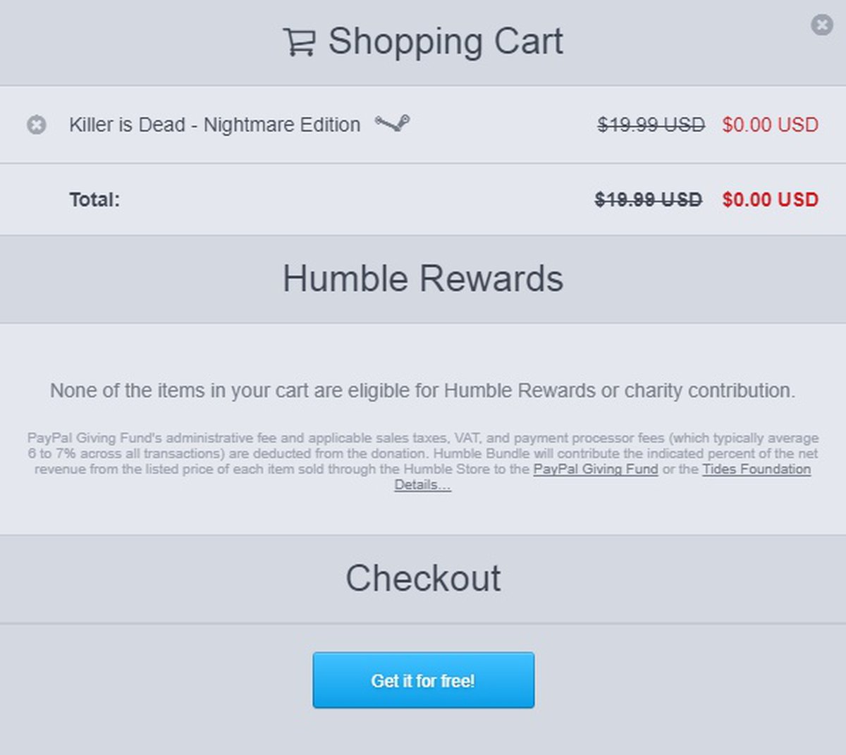 Алгоритм получения стандартный. Сначала отправляйтесь на страницу Killer is Dead - Nightmare Edition в Humble Bundle и добавьте игру в корзину. Теперь перейдите в саму корзину - вы увидите примерно такую картину: