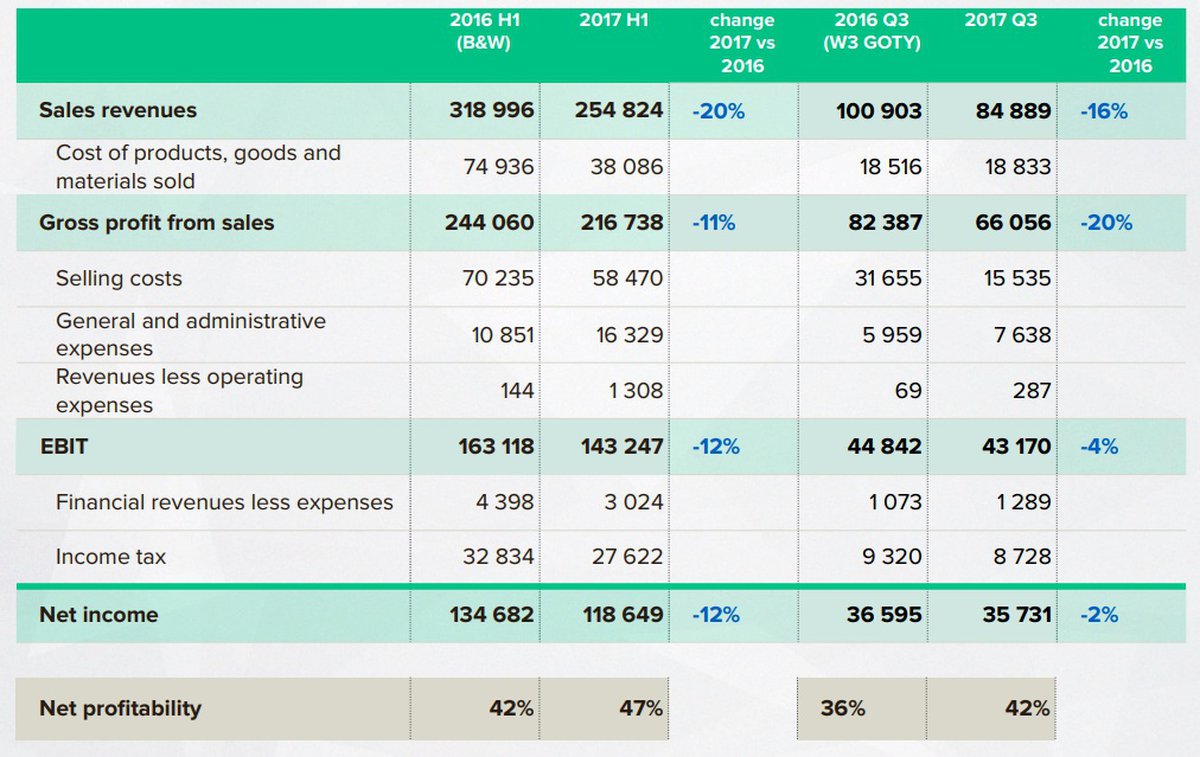 У студии CD Projekt RED наблюдается снижение как продаж, так и прибыли. Продажи год к году уменьшились на 28%, прибыль по сравнению с третьим кварталом 2016 года снизилась на 15% до $9.4 миллионов.