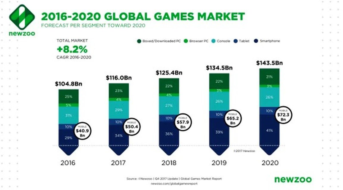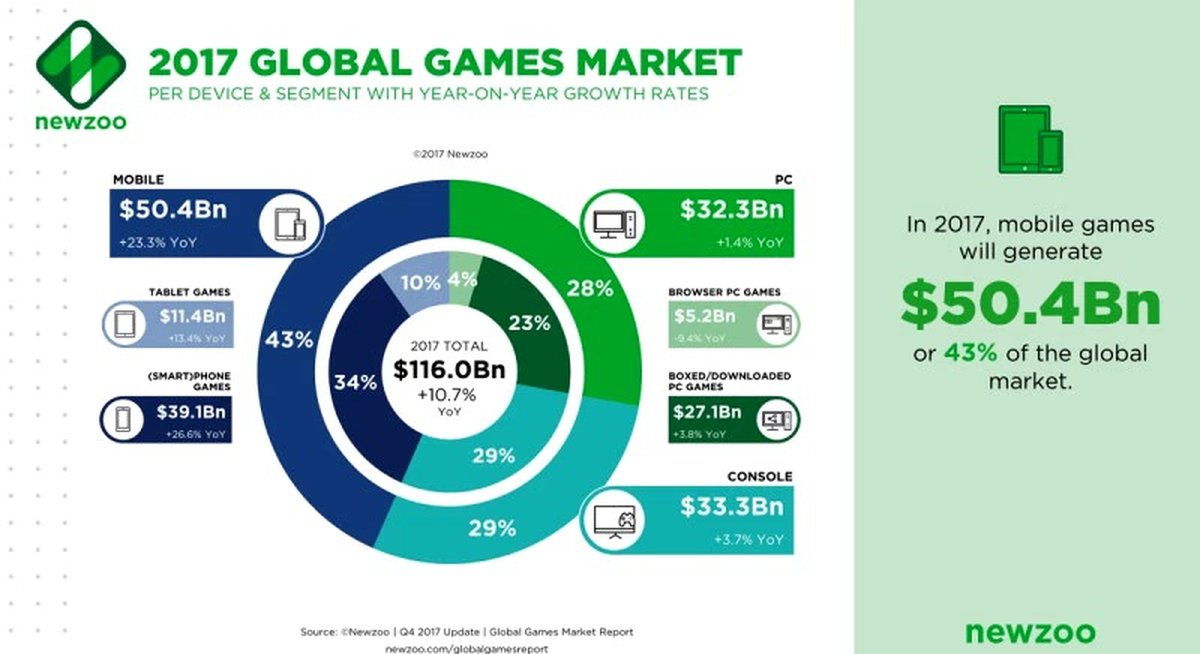 Самым крупным сегментом рынка все еще остаются мобильные игры: на их долю в 2017 году приходится $50.4 миллиарда, рост год к году составил 23.3%. На втором месте идут консольные игры с выручкой в $33.3 миллиарда и годовым ростом на 3.7%. Рынок игр для PC оценивается в $32.3 миллиарда, рост год к году 1.4%.