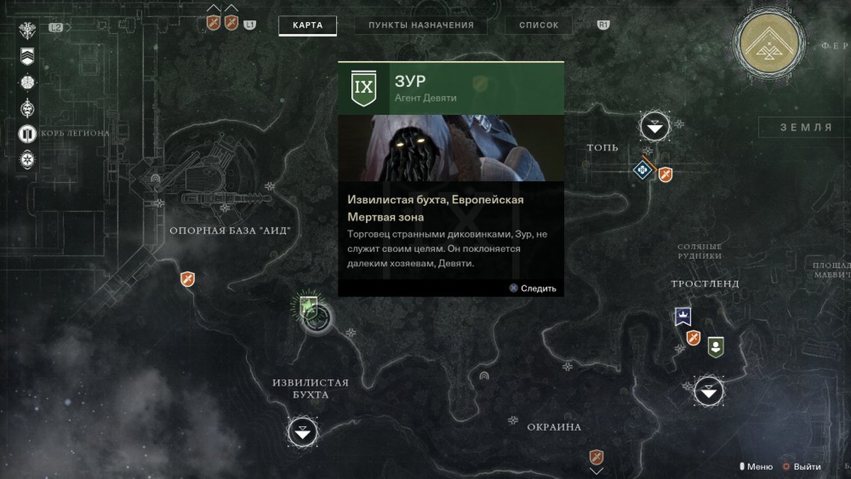 Загадочный адепт Девяти упорно не желает знакомиться с достопримечательностями миров Destiny 2: на этой неделе Зур снова на одной из старых точек. Теперь торговца нужно искать на Земле, в Европейской Мертвой Зоне.