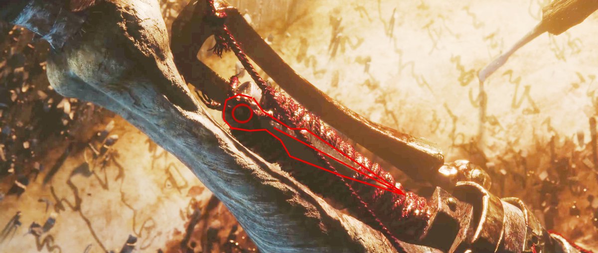 Во-первых, письмо, служащее фоном для тизера, написано с помощью курсивной формы кандзи - эти иероглифы часто использовались ниндзя. Во-вторых, в ролике можно заметить кунай, традиционное метательное оружие ниндзя. На скриншоте ниже обозначен контур куная.